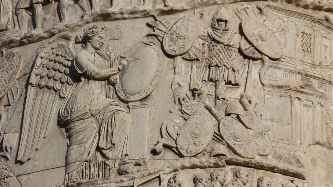 This image comes from Trajan’s column and depicts the personification of Victory inscribing the name Dacia onto a shield to be hung on the victory trophy depicted to the right of the scene signifying the end of the first Dacian war. The victory monument on the right of the scene shows a tree trunk covered in the armour and weapons of the defeated enemy which can tell us a lot about the weapons and armour used by the Dacians throughout these conflicts.